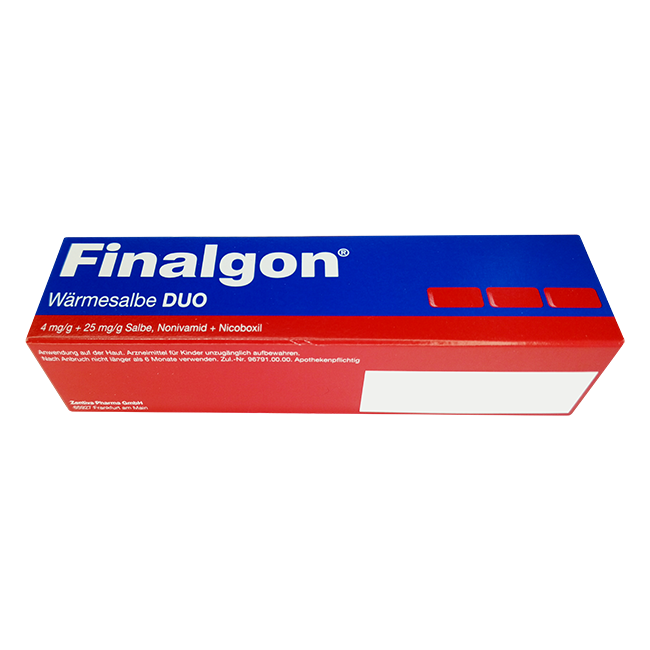 Finalgon DUO – местное средство на основе нонивамида и никобоксила, предназначенный для уменьшения боли и дискомфорта в мышцах и суставах за счёт разогревающего и сосудорасширяющего действия. Он способствует улучшению местного кровообращения, снижению болевых ощущений и ускорению восстановления после травм и воспалительных процессов.