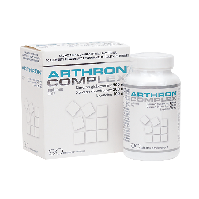 Артрон Комплекс выпускается в форме покрытых оболочкой таблеток по 90 штук в упаковке. Упаковка выполнена в светлых тонах (белый и светло-голубой), с названием продукта "ARTHRON COMPLEX" в центре передней стороны упаковки. На упаковке указаны основные активные компоненты и дозировки. Таблетки упакованы в пластиковую баночку с белой крышкой. Упаковка содержит всю необходимую информацию о составе, дозировке и условиях хранения.