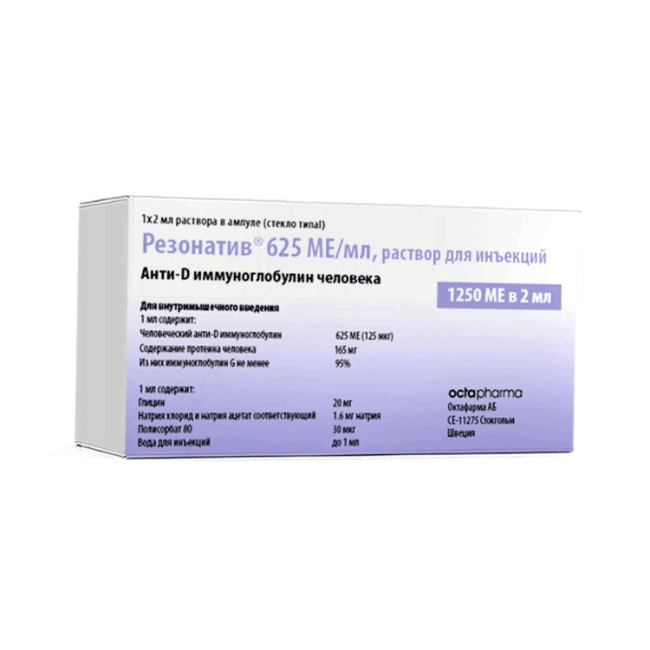 Резонатив —препарат, содержащий человеческий анти-D иммуноглобулин. Основная задача данного лекарственного средства — предотвращение иммунологического конфликта по резус-фактору (Rh), а также обеспечение пассивного иммунитета в ситуациях, когда есть вероятность контакта крови резус-отрицательного пациента с Rh-положительными эритроцитами.