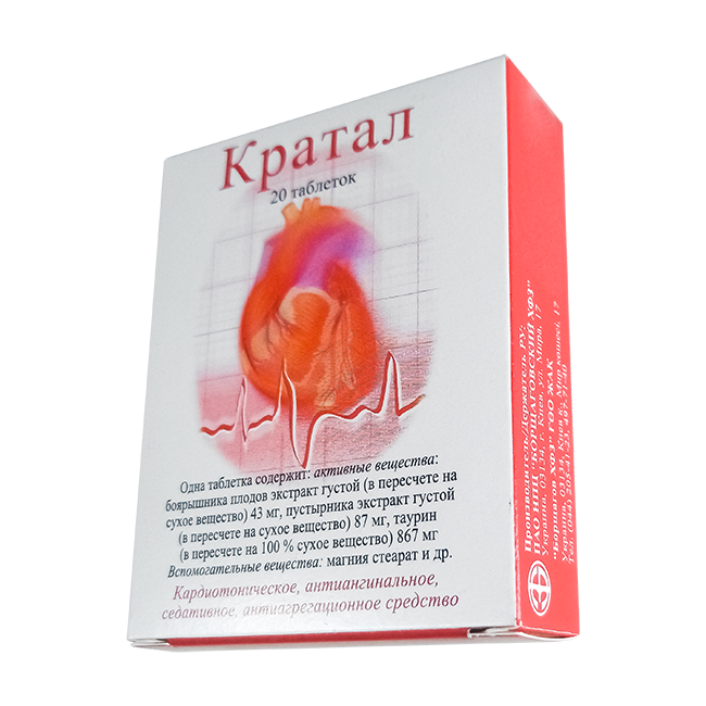 Препарат Кратал представляет собой комплексное средство, обладающее кардиотоническим, седативным и сосудорасширяющим действием. Медикамент улучшает работу сердечно-сосудистой системы и нервного аппарата сердца, нормализует сердечный ритм и устраняет спазмы коронарных сосудов.
