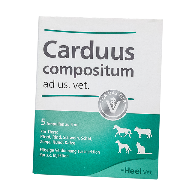 Препарат выпускается в виде раствора для инъекций по 5 мл в ампулах. Упаковка включает 5 ампул, предназначенных для введения под кожу (субкутанно). Упаковка оформлена в бело-зеленых тонах, на лицевой стороне присутствуют надписи: «Carduus compositum ad us. vet.» и «Heel Vet», а также изображение животных, для которых предназначен препарат (лошадь, крупный рогатый скот, свинья, собака, кошка). Маркировка указывает на использование препарата в ветеринарии и подчеркивает его назначение.