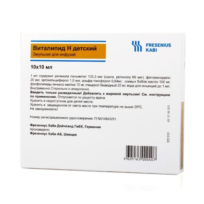 Виталипид N–комбинированный препарат на основе жирорастворимых витаминов и липидных компонентов, предназначенный для внутривенного применения. Используется у детей с недостаточным или нарушенным поступлением необходимых витаминов и жиров при парентеральном питании или в случаях, когда стандартный приём пищи невозможен или затруднён.